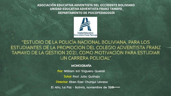 “ESTUDIO DE LA POLICÍA NACIONAL BOLIVIANA, PARA LOS ESTUDIANTES DE LA PROMOCION DEL COLEGIO ADVENTISTA FRANZ TAMAYO DE LA GESTION 2021, COMO MOTIVACIÓN PARA ESTUDIAR UN CARRERA POLICIAL”