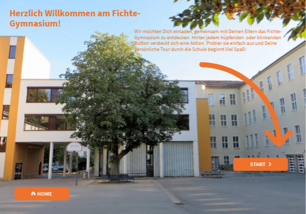 Wir möchten Dich einladen, gemeinsam mit Deinen Eltern das Fichte- Gymnasium zu entdecken. Hinter jedem hüpfenden oder blinkenden Button versteckt sich eine Aktion. Probier sie einfach aus und Deine persönliche Tour durch die Schule beginnt.Viel Spaß!