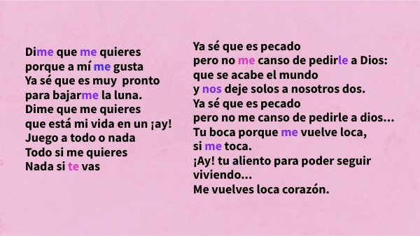 Dime que me quieres porque a mí me gusta Ya sé que es muy pronto para bajarme la luna. Dime que me quieres que está mi vida en un ¡ay! Juego a todo o nada Todo si me quieres Nada si te vas