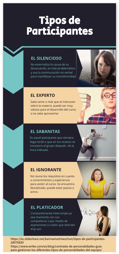 https://es.slideshare.net/karinamartinezchun/tipos-de-participantes-28076830https://www.wrike.com/es/blog/contraste-de-personalidades-guia-para-gestionar-los-diferentes-tipos-de-personalidades-del-equipo/