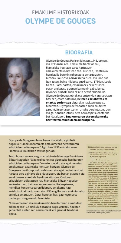 Olympe de Gouges Parisen jaio zen, 1748. urtean, eta 1793an hil zen. Emakume frantziar hau, Frantziako Iraultzan parte hartu zuen emakumeetako bat izan zen. 1765ean, Frantziako hornitzaile batekin ezkontzera behartu zuten. Gizonak Louis-Yves Auvre izena zuen, eta ume bat izan zuten, baina hilabete gutxi barru, 1766an, Louis hil zen. Garai hartan, emakumeek ezin zituzten obrak argitaratu gizonen baimenik gabe, beraz, Olympek erabaki zuen ez zela berriz ezkonduko. Olympe de Gouges obrak eta antzerkiak argitaratzen hasi zen, esate baterako, Beltzen esklabotza eta onartze zoriontsua obrarekin hasi zen ospetsu bihurtzen. Olympek defendatzen zuen baldintza garrantzitsuena pertsonen arteko berdintasuna zen, eta gai honekin loturik bere obra ospetsuenetariko bat idatzi zuen, Emakumearen eta emakumezko herritarren eskubideen adierazpena.