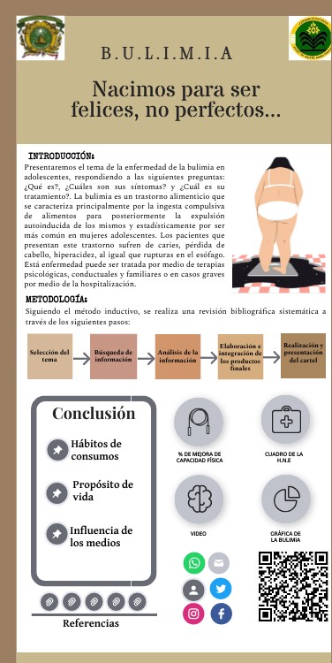 Presentaremos el tema de la enfermedad de la bulimia en adolescentes, respondiendo a las siguientes preguntas: ¿Qué es?, ¿Cuáles son sus síntomas? y ¿Cuál es su tratamiento?. La bulimia es un trastorno alimenticio que se caracteriza principalmente por la ingesta compulsiva de alimentos para posteriormente la expulsión autoinducida de los mismos y estadísticamente por ser más común en mujeres adolescentes. Los pacientes que presentan este trastorno sufren de caries, pérdida de cabello, hiperacidez, al igual que rupturas en el esófago. Está enfermedad puede ser tratada por medio de terapias psicológicas, conductuales y familiares o en casos graves por medio de la hospitalización.