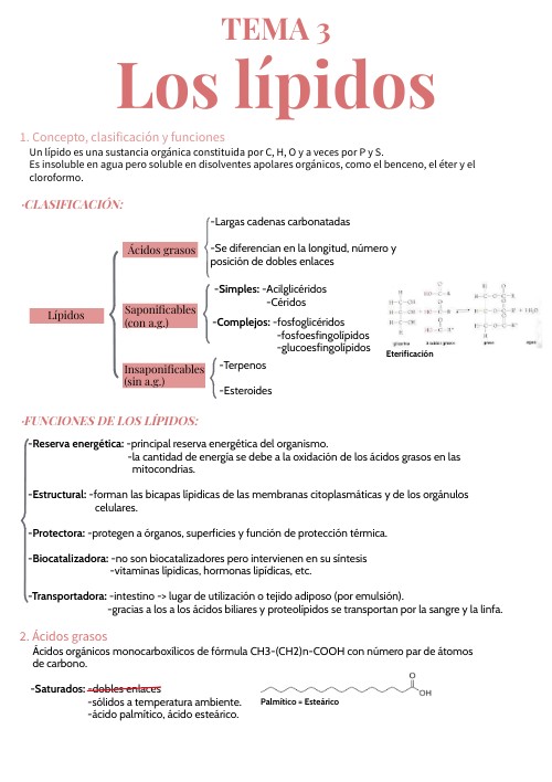 -Punto de fusión bajo: -depende de la longitud y nº de dobles enlaces -en saturados: ^nº de C -> + enlaces a romper -> + energía calorífica -> +^pnto. fusión -en insaturados: al haber = se forman codos -> + dificil la creación de enlaces de Van der Waals -> v pnto. de fusión. -Esterificación: ácido graso + alcohol mediante enlace covalente = éster; se libera una molécula de agua.