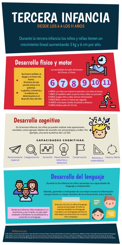 UVEG (2021). Lección 8. Desarrollo físico y motor del niño en la tercera infancia. Procesos del desarrollo en la infancia y adolescencia. (Módulo en línea). Universidad Virtual del estado de Guanajuato. UVEG (2021). Lección 9. Desarrollo cognitivo del niño en la tercera infancia. Procesos del desarrollo en la infancia y adolescencia. (Módulo en línea). Universidad Virtual del estado de Guanajuato. UVEG (2021). Lección 10. Desarrollo del lenguaje del niño en la tercera infancia. Procesos del desarrollo en la infancia y adolescencia. (Módulo en línea). Universidad Virtual del estado de Guanajuato.