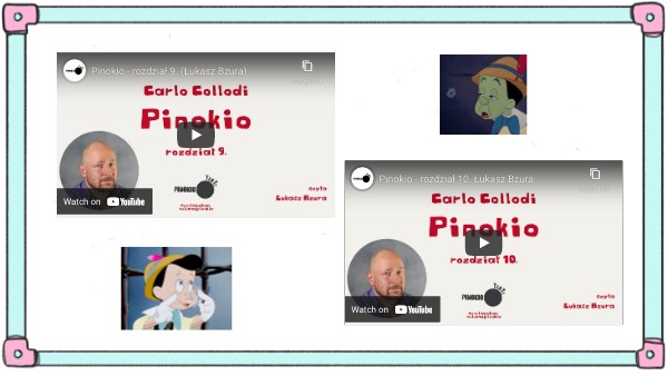 Uratowanie życia Arlekinowi. Wzbudzenie litości u tyrana. Zakup biletu do Teatru Marionetek. Drewniany pajacyk w niebezpieczeństwie. Podarowanie Pinokiowi pięciu złotych monet. Pojawienie się Połykacza Ognia. Powitanie Pinokia przez Marionetki.