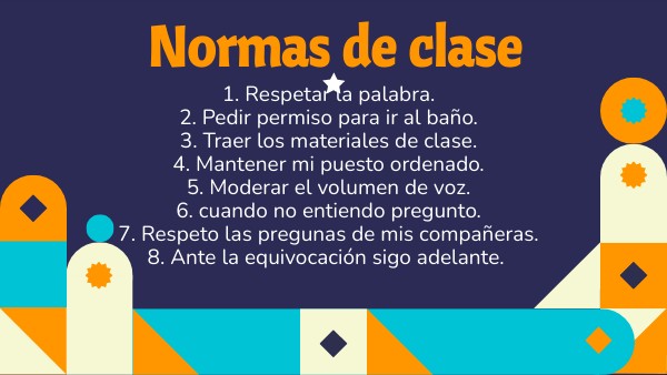 1. Respetar la palabra.2. Pedir permiso para ir al baño. 3. Traer los materiales de clase. 4. Mantener mi puesto ordenado. 5. Moderar el volumen de voz. 6. cuando no entiendo pregunto. 7. Respeto las pregunas de mis compañeras. 8. Ante la equivocación sigo adelante.