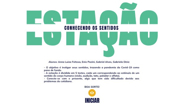 Alunos: Anna Luiza Feitosa, Enio Pazini, Gabriel Alves, Gabriela Diniz - O objetivo é instigar seus sentidos, trazendo a pandemia da Covid-19 como pano de fundo. - A estação é dividida em 5 testes, cada um correspondendo ao estímulo de um sentido do corpo humano (visão, audição, tato, paladar e olfato). - Conecte-se com o presente, algo que tem sido dificultado devido aos problemas do cotidiano. BOA SORTE!
