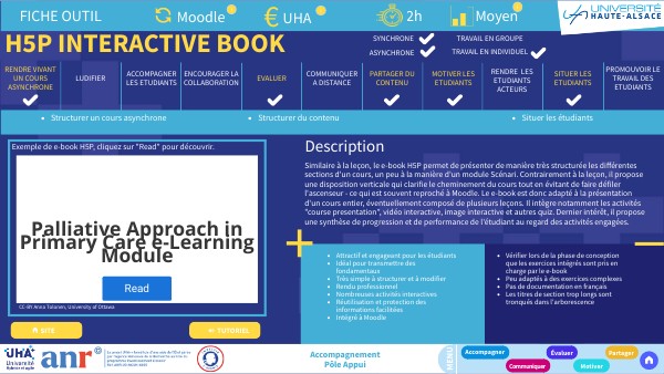 Similaire à la leçon, le e-book H5P permet de présenter de manière très structurée les différentes sections d'un cours, un peu à la manière d'un module Scénari. Contrairement à la leçon, il propose une disposition verticale qui clarifie le cheminement du cours tout en évitant de faire défiler l'ascenseur - ce qui est souvent reproché à Moodle. Le e-book est donc adapté à la présentation d'un cours entier, éventuellement composé de plusieurs leçons. Il intègre notamment les activités "course presentation", vidéo interactive, image interactive et autres quiz. Dernier intérêt, il propose une synthèse de progression et de performance de l'étudiant au regard des activités engagées.