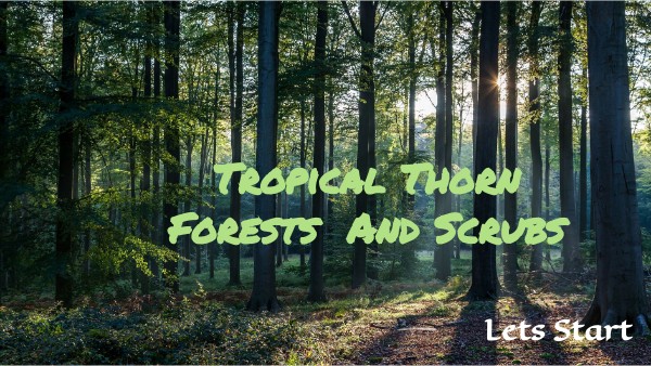 Acknowledgment Its a wonderful oppurtunity to make and perform a PPT on this topic ' TROPICAL THORN FOREST AND SCRUBS' . We would like to thank our teacher Ms.Pragyan Ma'am for this oppurtunity . This also helped us in researching and gaining some new knowledge, and thank you to all my fellowmates. We learn our mistakes and will do better next time