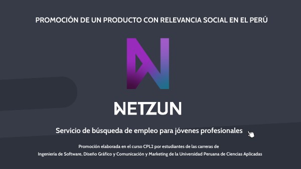 Netzun es una plataforma digital encargada de buscar empleo a jóvenes profesionales desempleados o sin experiencia laboral. Su objetivo es ser un apoyo para estudiantes recién egresados o jóvenes sin experiencia laboral en la búsqueda de un empleo que se adecúe a su perfil y habilidades. Para facilitar su selección dentro de alguna empresa y poder ser seleccionados, brindan a estos jóvenes acceso a cursos de diferentes temas, potencializando sus conocimientos y ofreciéndoles certificados que los acrediten.