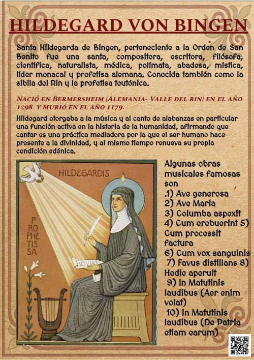 Santa Hildegarda de Bingen, perteneciente a la Orden de San Benito fue una santa, compositora, escritora, filósofa, científica, naturalista, médica, polímata, abadesa, mística, líder monacal y profetisa alemana. Conocida también como la sibila del Rin y la profetisa teutónica.