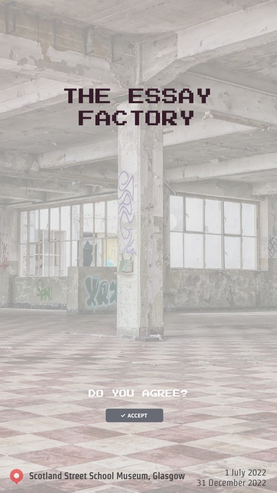 The exhibition will take place from July 1st, 2022, to December 31st, 2022; for a total of six months. We are honored to have our first exhibition taking place at the Scotland Street School Museum (Glasgow), in occasion of its reopening. The exhibition will consist of three sections. First, participants will be welcomed by a touchscreen interactive graphic, which will allow them to explore all the complex facets and impact that characterize TurnItIn. Secondly, participants will sit in a space resembling a classroom, and will have the opportunity to complete two activities using TurnItIn, called "The Art of Flattery"and "Everyday Plagiarism". These will be based on global texts and languages, in order to experiment more widely with the software, also with non-Western written outputs. Participants will therefore receive an "Originality report", which they will be able to discuss and to assess. Did the software say you plagiarized? Did you actually plagiarize? Was the score dependent on the source you used? Having done this experiment, do you think that TurnItIn impacts the concept of plagiarism? How? More information on: www.theessayfactory.co.uk/
