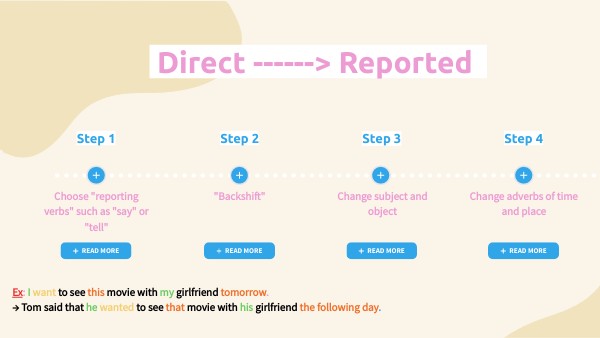 Ex: I want to see this movie with my girlfriend tomorrow. → Tom said that he wanted to see that movie with his girlfriend the following day.