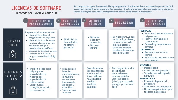 Se compara dos tipos de software (libre y propietario). El software libre, se caracteriza por ser de fácil acceso por la distribución gratuita entre usuarios . El software de propietario, trabaja con el código de fuente restringido al usuario, protegiendo los derechos del creaor o propietario.