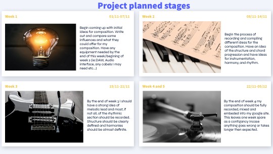 By the end of week 4 my composition should be fully recorded, mixed and embeded into my google site. This leaves one week spare as a contigancy incase anything goes wrong or takes longer then expected.