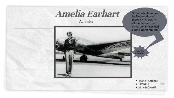 Date de Naissance: 24 Juillet 1897 Date de mort: 5 Janvier 1939 Lieu de Naissance: Atchison-KANSAS Travail: Pilote d'avion, infirmière,assistance social , journaliste Qu'a -t-elle fait d'importants: 1ère femme à avoir traversé l'océan Pacifique par les airs