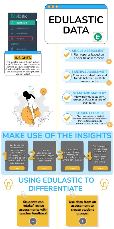 The insights tab on the left side of your Edulastic account is where you can find all your assessment data. Check out all the possible reports, in the 4 categories on the right, that you can utilize!