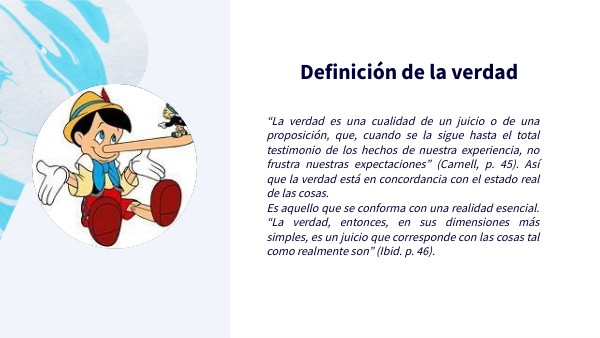 “La verdad es una cualidad de un juicio o de una proposición, que, cuando se la sigue hasta el total testimonio de los hechos de nuestra experiencia, no frustra nuestras expectaciones” (Carnell, p. 45). Así que la verdad está en concordancia con el estado real de las cosas.Es aquello que se conforma con una realidad esencial. “La verdad, entonces, en sus dimensiones más simples, es un juicio que corresponde con las cosas tal como realmente son” (Ibid. p. 46).