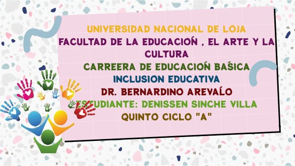 UNIVERSIDAD NACIONAL DE LOJAFACULTAD DE LA EDUCACIÓN , EL ARTE Y LA CULTURA CARREERA DE EDUCACIÓN BÁSICA INCLUSION EDUCATIVA DR. BERNARDINO AREVÁLO ESTUDIANTE: DENISSEN SINCHE VILLA QUINTO CICLO "A"