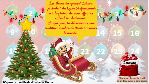 Les élèves du groupe"Culture générale " du Lycée Professionnel ont le plaisir de vous offrir ce calendrier de l'avent. Chaque jour, tu découvriras une tradition insolite de Noël à travers le monde.