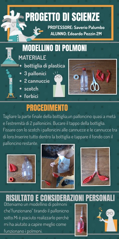 Otteniamo un modellino di polmoni che"funzionano" tirando il pallonicno sotto.Mi è piaciuto realizzarlo perchè mi ha aiutato a capire meglio come funzionano i polmoni.