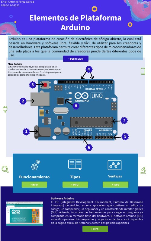 Arduino es una plataforma de creación de electrónica de código abierto, la cual está basada en hardware y software libre, flexible y fácil de utilizar para los creadores y desarrolladores. Esta plataforma permite crear diferentes tipos de microordenadores de una sola placa a los que la comunidad de creadores puede darles diferentes tipos de uso.