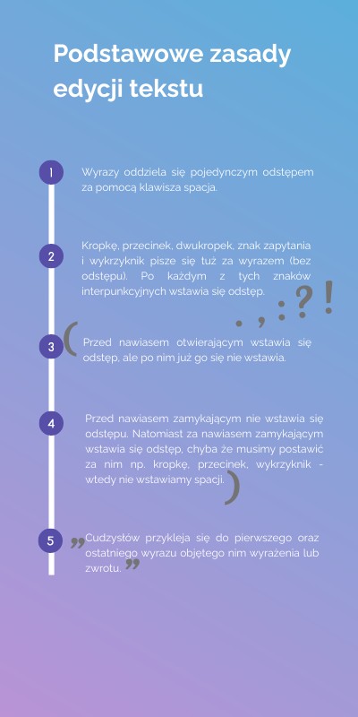 Kropkę, przecinek, dwukropek, znak zapytania i wykrzyknik pisze się tuż za wyrazem (bez odstępu). Po każdym z tych znaków interpunkcyjnych wstawia się odstęp.
