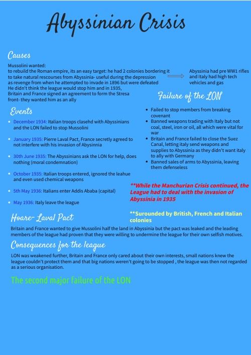 - December 1934: Italian troops clasehd with Abyssinians and the LON failed to stop Mussolini