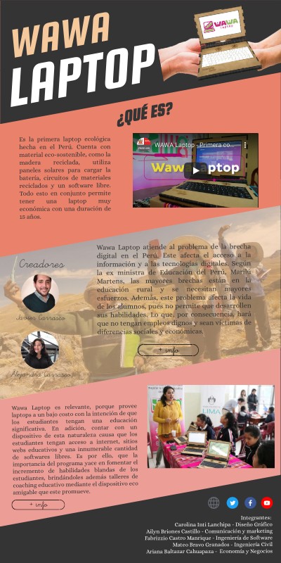 Es la primera laptop ecológica hecha en el Perú. Cuenta con material eco-sostenible, como la madera reciclada, utiliza paneles solares para cargar la batería, circuitos de materiales reciclados y un software libre. Todo esto en conjunto permite tener una laptop muy económica con una duración de 15 años.