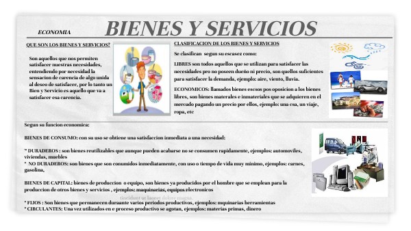 Realizar una infografía en la que relacione conceptos, imágenes, ejemplos y recursos, que expliquen la clasificación de bienes y servicios.