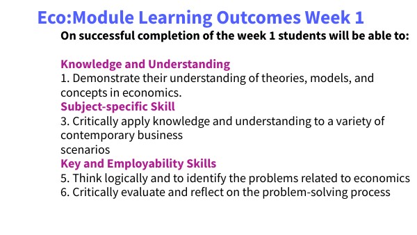 On successful completion of the week 1 students will be able to: Knowledge and Understanding 1. Demonstrate their understanding of theories, models, and concepts in economics. Subject-specific Skill 3. Critically apply knowledge and understanding to a variety of contemporary business scenarios Key and Employability Skills 5. Think logically and to identify the problems related to economics 6. Critically evaluate and reflect on the problem-solving process