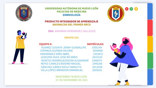 UNIVERSIDAD AUTÓNOMA DE NUEVO LEÓN FACULTAD DE MEDICINA EMBRIOLOGÍA PRODUCTO INTEGRADOR DE APRENDIZAJE ANOMALÍAS DEL PRIMER ARCO DRA. AMAIRANI HERNANDEZ GALLEGOS GRUPO 010 EQUIPO 4: MATRÍCULAS: ALVAREZ SUSAITA JENNY GUADALUPE 1956149 ESPARZA GUZMAN VALERIA 2008868 HERNÁNDEZ NIÑO ABRIL 1993872 LEDEZMA SILVA JOSE RICARDO 2015333 MONTES RODRÍGUEZKEVIN ALEXANDER 1948474 REYES CANALES BIDEMEI RAGUEL 1995268 SÁNCHEZ GÁMEZ KEILA YAMILETH 2013038 VILLA LÓPEZ BRANDON EMMANUEL 2005001 MONTERREY NUEVO LEÓN 19 DE NOVIEMBRE DE 2021