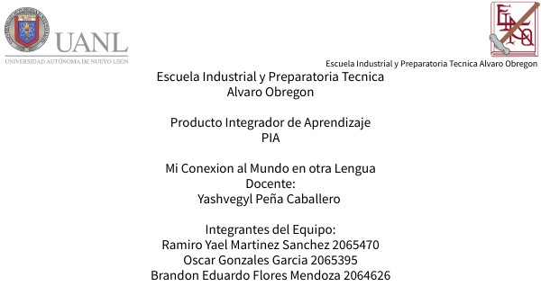 Escuela Industrial y Preparatoria Tecnica Alvaro Obregon Producto Integrador de Aprendizaje PIA Mi Conexion al Mundo en otra Lengua Docente: Yashvegyl Peña Caballero Integrantes del Equipo: Ramiro Yael Martinez Sanchez 2065470 Oscar Gonzales Garcia 2065395 Brandon Eduardo Flores Mendoza 2064626