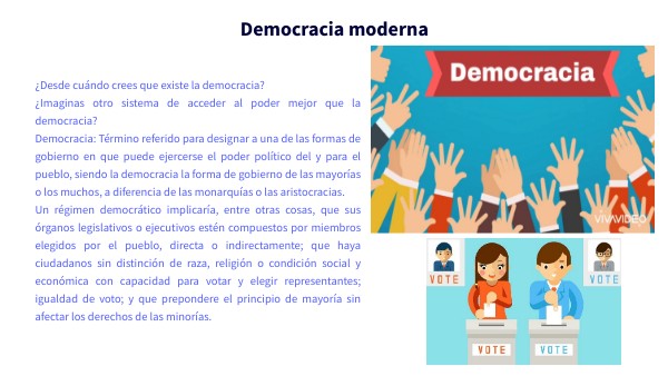 ¿Desde cuándo crees que existe la democracia? ¿Imaginas otro sistema de acceder al poder mejor que la democracia? Democracia: Término referido para designar a una de las formas de gobierno en que puede ejercerse el poder político del y para el pueblo, siendo la democracia la forma de gobierno de las mayorías o los muchos, a diferencia de las monarquías o las aristocracias. Un régimen democrático implicaría, entre otras cosas, que sus órganos legislativos o ejecutivos estén compuestos por miembros elegidos por el pueblo, directa o indirectamente; que haya ciudadanos sin distinción de raza, religión o condición social y económica con capacidad para votar y elegir representantes; igualdad de voto; y que prepondere el principio de mayoría sin afectar los derechos de las minorías.