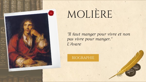 Nom de scène :Molière Vrai nom : Jean-Baptiste Poquelin Né en : Janvier 1622 à paris Mort le :17 février 1673 (à 51 ans). Professions : acteur, dramaturge, poète et régisseur mais avant avocat