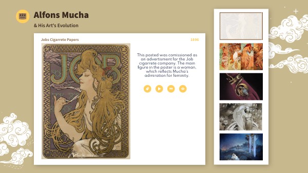 This posted was comissioned as an advertisment for the Job cigarrete company. The main figure in the poster is a woman, which reflects Mucha's admiration for feminity.