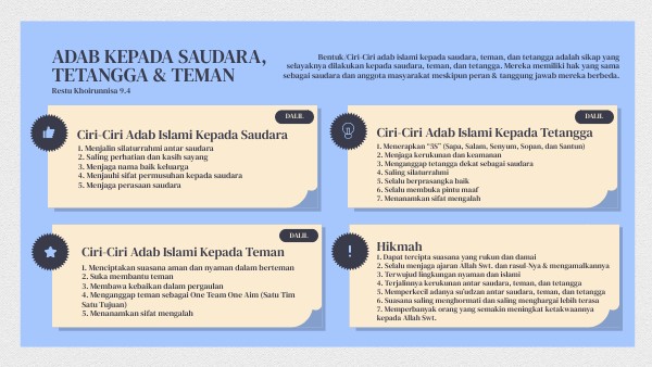 Bentuk/Ciri-Ciri adab islami kepada saudara, teman, dan tetangga adalah sikap yang selayaknya dilakukan kepada saudara, teman, dan tetangga. Mereka memiliki hak yang sama sebagai saudara dan anggota masyarakat meskipun peran & tanggung jawab mereka berbeda.