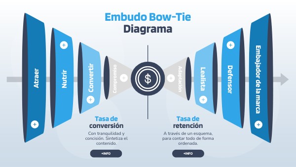 Ve más allá del embudo de ventas tradicional con esta plantilla gratuita de Funnel Bow Tie. Personalízala para entender todo el ciclo de vida del cliente, desde la adquisición hasta la retención. ¡Una visión 360 grados!