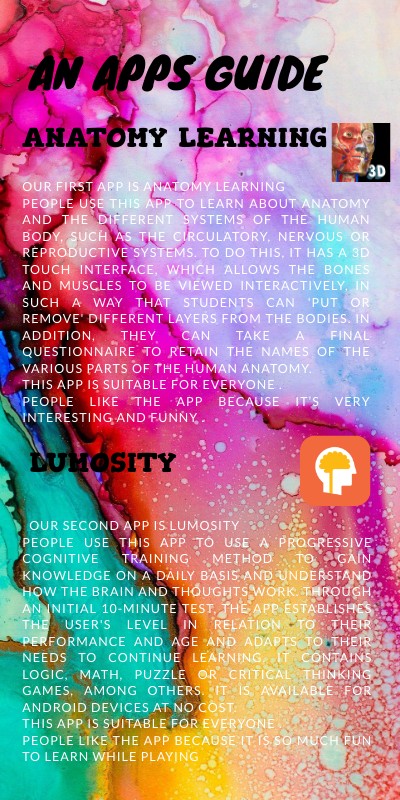 Our first app is Anatomy learning People use this app to learn about anatomy and the different systems of the human body, such as the circulatory, nervous or reproductive systems. To do this, it has a 3D touch interface, which allows the bones and muscles to be viewed interactively, in such a way that students can 'put or remove' different layers from the bodies. In addition, they can take a final questionnaire to retain the names of the various parts of the human anatomy. This app is suitable for everyone . People like the app because it’s very interesting and funny .