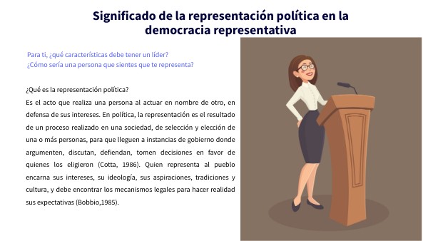¿Qué es la representación política? Es el acto que realiza una persona al actuar en nombre de otro, en defensa de sus intereses. En política, la representación es el resultado de un proceso realizado en una sociedad, de selección y elección de una o más personas, para que lleguen a instancias de gobierno donde argumenten, discutan, defiendan, tomen decisiones en favor de quienes los eligieron (Cotta, 1986). Quien representa al pueblo encarna sus intereses, su ideología, sus aspiraciones, tradiciones y cultura, y debe encontrar los mecanismos legales para hacer realidad sus expectativas (Bobbio,1985).