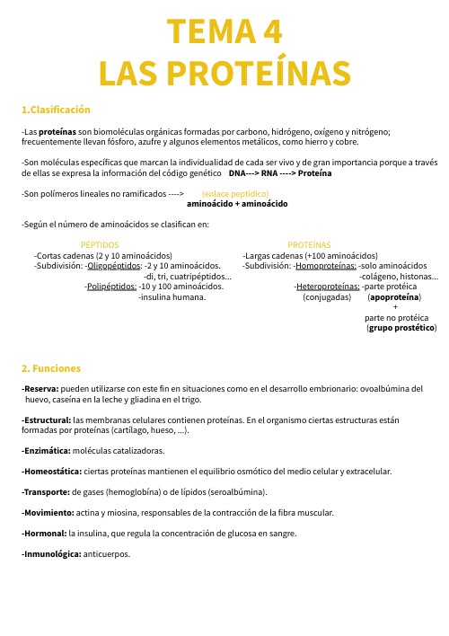 -Las proteínas son biomoléculas orgánicas formadas por carbono, hidrógeno, oxígeno y nitrógeno; frecuentemente llevan fósforo, azufre y algunos elementos metálicos, como hierro y cobre. -Son moléculas específicas que marcan la individualidad de cada ser vivo y de gran importancia porque a través de ellas se expresa la información del código genético DNA---> RNA ----> Proteína -Son polímeros lineales no ramificados ----> (enlace peptídico) aminoácido + aminoácido -Según el número de aminoácidos se clasifican en: PÉPTIDOS PROTEÍNAS -Cortas cadenas (2 y 10 aminoácidos) -Largas cadenas (+100 aminoácidos) -Subdivisión: -Oligopéptidos: -2 y 10 aminoácidos. -Subdivisión: -Homoproteínas: -solo aminoácidos -di, tri, cuatripéptidos... -colágeno, histonas... -Polipéptidos: -10 y 100 aminoácidos. -Heteroproteínas: -parte protéica -insulina humana. (conjugadas) (apoproteína) + parte no protéica (grupo prostético)