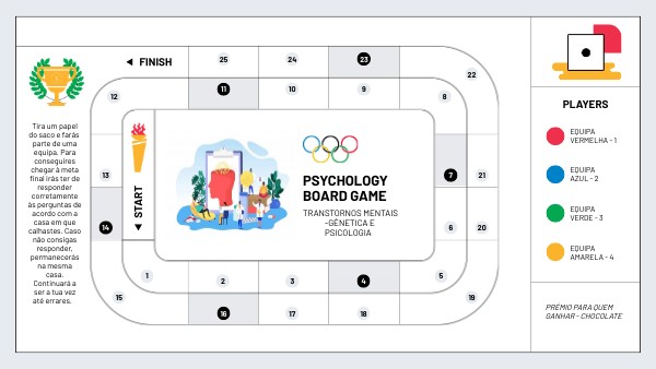 Tira um papel do saco e farás parte de uma equipa. Para conseguires chegar à meta final irás ter de responder corretamente às perguntas de acordo com a casa em que calhastes. Caso não consigas responder, permanecerás na mesma casa. Continuará a ser a tua vez até errares.