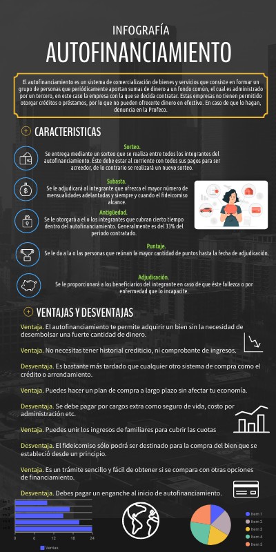 Ventaja. El autofinanciamiento te permite adquirir un bien sin la necesidad de desembolsar una fuerte cantidad de dinero.Ventaja. No necesitas tener historial crediticio, ni comprobante de ingresos. Desventaja. Es bastante más tardado que cualquier otro sistema de compra como el crédito o arrendamiento. Ventaja. Puedes hacer un plan de compra a largo plazo sin afectar tu economía. Desventaja. Se debe pagar por cargos extra como seguro de vida, costo por administración etc. Ventaja. Puedes unir los ingresos de familiares para cubrir las cuotas Desventaja. El fideicomiso sólo podrá ser destinado para la compra del bien que se estableció desde un principio. Ventaja. Es un trámite sencillo y fácil de obtener si se compara con otras opciones de financiamiento. Desventaja. Debes pagar un enganche al inicio de autofinanciamiento.