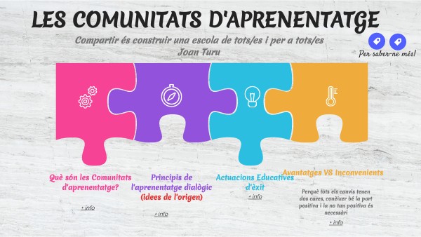 - Són un projecte de transformació social i cultural basat en l’aplicació d’aquelles actuacions educatives d’èxit (AEE) de les quals s'ha demostrat científicament que milloren el rendiment educatiu i la convivència. - Les comunitats d'aprenentatge impliquen totes les persones que, de forma directa o indirecta, influeixen en l'aprenentatge i el desenvolupament dels estudiants (mestres, professors, familiars, membres d'associacions i organitzacions veïnals i locals i persones voluntàries).
