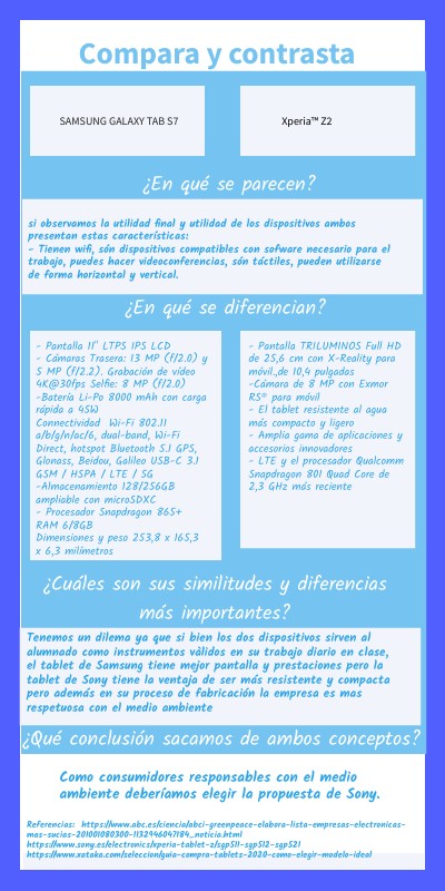 Tenemos un dilema ya que si bien los dos dispositivos sirven al alumnado como instrumentos vàlidos en su trabajo diario en clase, el tablet de Samsung tiene mejor pantalla y prestaciones pero la tablet de Sony tiene la ventaja de ser más resistente y compacta pero además en su proceso de fabricación la empresa es mas respetuosa con el medio ambiente