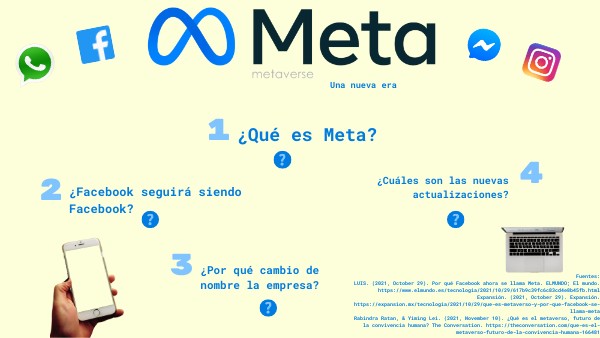 Fuentes:LUIS. (2021, October 29). Por qué Facebook ahora se llama Meta. ELMUNDO; El mundo. https://www.elmundo.es/tecnologia/2021/10/29/617b9c39fc6c83cd4e8b45fb.html Expansión. (2021, October 29). Expansión. https://expansion.mx/tecnologia/2021/10/29/que-es-metaverso-y-por-que-facebook-se-llama-meta Rabindra Ratan, & Yiming Lei. (2021, November 10). ¿Qué es el metaverso, futuro de la convivencia humana? The Conversation. https://theconversation.com/que-es-el-metaverso-futuro-de-la-convivencia-humana-166481