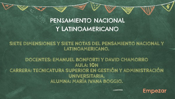 SIETE DIMENSIONES Y SIETE NOTAS DEL PENSAMIENTO NACIONAL Y LATINOAMERICANO. DOCENTES: Emanuel bonforti y david chamorro AULA: 10N CARRERA: TECNICATURA SUPERIOR EN GESTIÓN Y ADMINISTRACIÓN UNIVERSITARIA. ALUMNA: MARÍA IVANA BOGGIO.