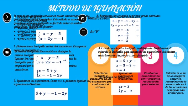 El método de igualación consiste en aislar una incógnita en las dos ecuaciones para igualarlas.