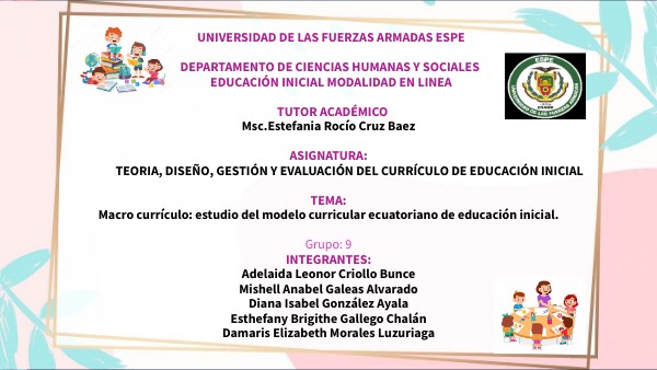 UNIVERSIDAD DE LAS FUERZAS ARMADAS ESPE DEPARTAMENTO DE CIENCIAS HUMANAS Y SOCIALES EDUCACIÓN INICIAL MODALIDAD EN LINEA TUTOR ACADÉMICO Msc.Estefania Rocío Cruz Baez ASIGNATURA: TEORIA, DISEÑO, GESTIÓN Y EVALUACIÓN DEL CURRÍCULO DE EDUCACIÓN INICIAL TEMA:Macro currículo: estudio del modelo curricular ecuatoriano de educación inicial. Grupo: 9 INTEGRANTES: Adelaida Leonor Criollo Bunce Mishell Anabel Galeas Alvarado Diana Isabel González Ayala Esthefany Brigithe Gallego Chalán Damaris Elizabeth Morales Luzuriaga