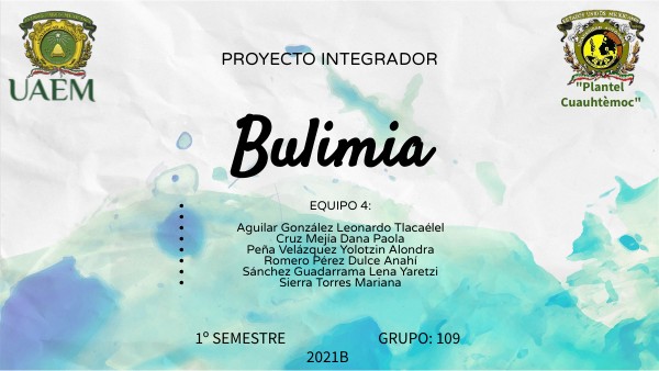 2. OSM. (agosto 28, 2018). Bulimia nerviosa. noviembre 26,2021, de Oficina para la Salud de la Mujer Sitio web: https://espanol.womenshealth.gov/mental-health/mental-health-conditions/eating-disorders/bulimia-nervosa 3. Relaciones exteriores, defensa nacional y educación pública. (enero 9, 2018). Campaña de salud para combatir la Bulimia y Anorexia. noviembre 26, 2021, de PLF Sitio web: http://sil.gobernacion.gob.mx/Archivos/Documentos/2018/01/asun_3658362_20180117_151560410